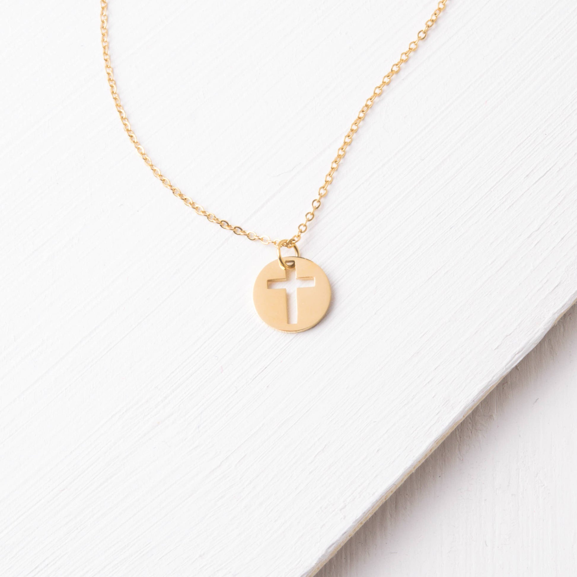 The Carolyn Necklace features a circle charm with a cross cutout suspended from a classic 14k gold plated chain. This simple piece is perfect for gift giving! Box size and color may vary. Materials: 14k gold plated stainless steel cross necklace on a 14k gold plated stainless steel chain. Size: 16 inches. Hypoallergenic; lead and cadmium free with nickel content less than 100 ppm.