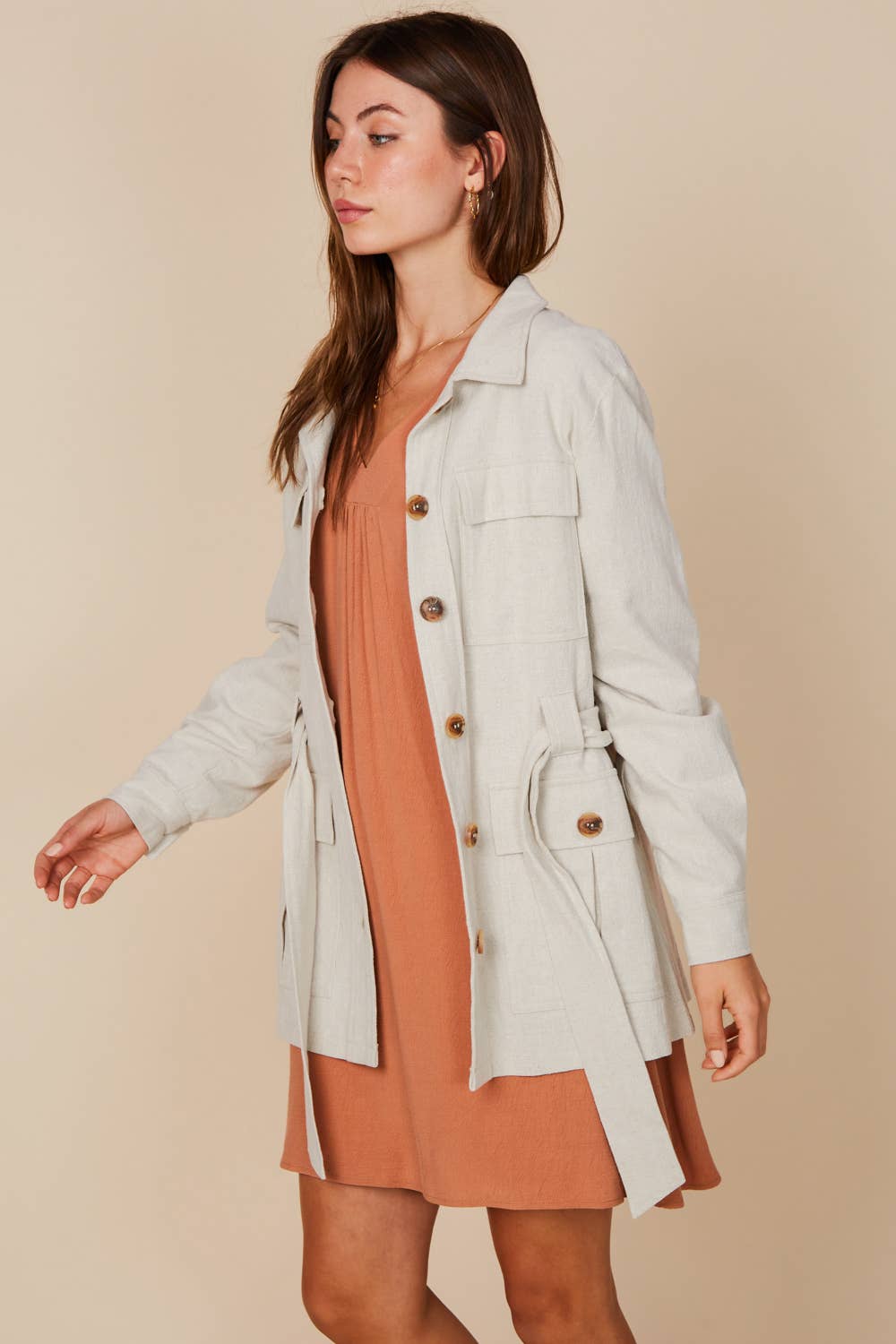 Add this piece to your wardrobe. A Pocket Long Sleeve Outwear, where functionality meets fashion in perfect harmony. Crafted with precision, this outwear piece features a sleek and sophisticated design, enhanced by delicate button details that add a touch of elegance. Its thin fabric offers comfort and versatility, making it ideal for layering in any season. With practical pockets for added convenience, this long sleeve outwear effortlessly combines style and utility, ensuring you stay chic and organized wherever you go.