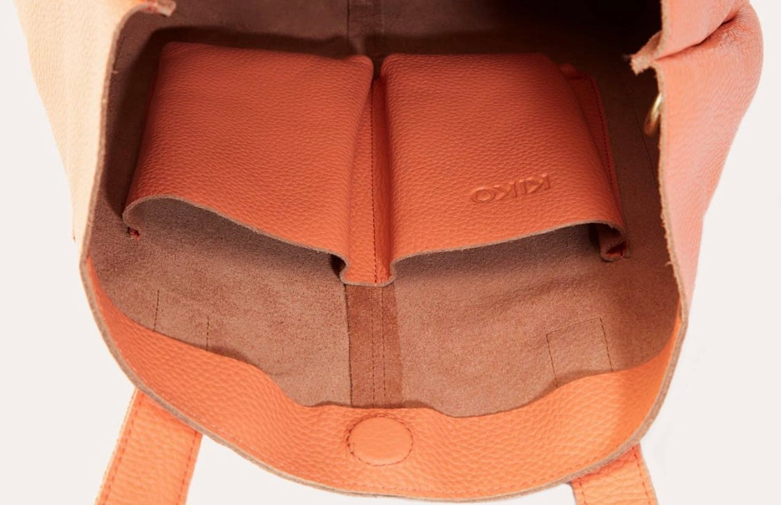 Top grain cowhide pebble leather. Unlined interior. Removable shoulder strap. 1 exterior pocket and 2 interior. Pockets. Exterior pocket 8.5" l x 10" w. 14" L x 17" W x 7.5" D.