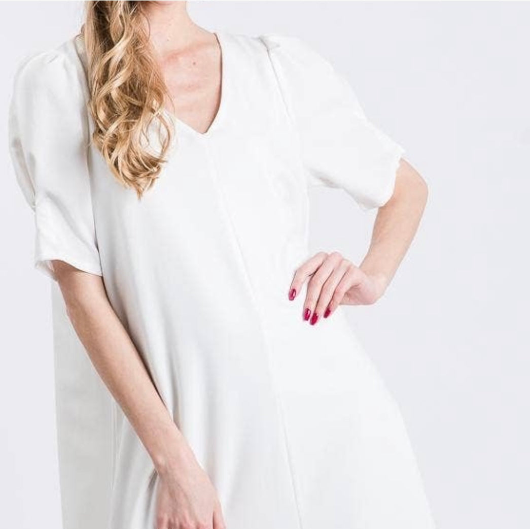 Pretty Puff sleeve V-neck dress. Soft and Sheek this dress offers the sophistication for any occasion.